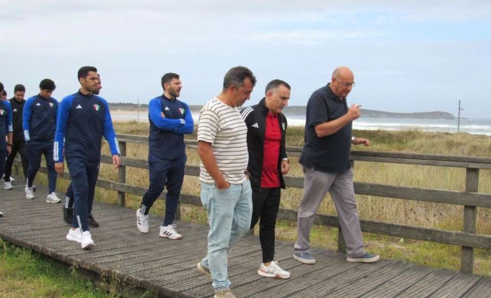 Jugadores y equipo técnico, encabezados por el entrenador, Bruno García, tomaban un respiro en las sesiones deportivas para conocer uno de los tesoros naturales de la comarca: la playa y laguna de A Frouxeira.