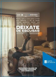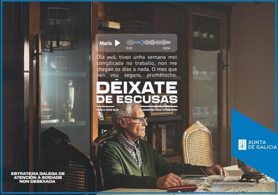 podemos hacer cada uno de nosotros, en nuestro entorno, para evitar que una persona sufra una situación de soledad no deseada, la Xunta está difundiendo una campaña en medios de comunicación que refleja situaciones que se repiten a menudo en cualquier familia, donde las ocupaciones del día a día a veces impiden que nos paremos a pensar sobre si, en realidad, podemos hacer algo más por acompañar a nuestros mayores o gente en riesgo de sentirse sola.