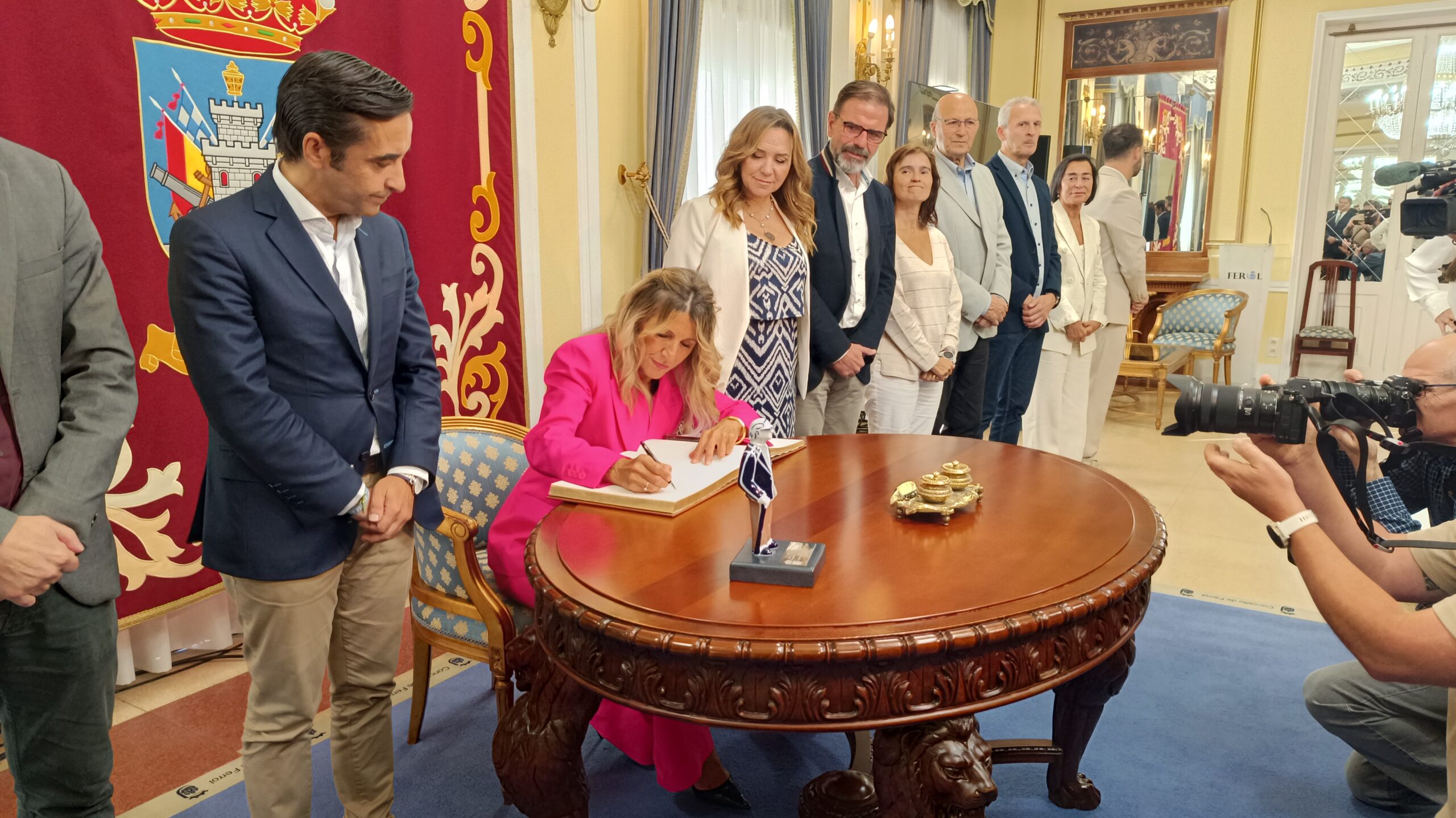 En el despacho de alcaldía mantenía una reunión con el alcalde a la que posteriormente se incorporaron los portavoces de los grupos municipales, para posteriormente saludar al resto de la corporación y firmar en el Libro de Oro de la ciudad recordando en sus líneas su procedencia de una ciudad “de loita, como Concepción Arenal”. El regidor, tras entregarle una figura de Sargadelos de Torrente Ballester como recuerdo de su visita, le recordaba que el Concello de Ferrol “é a túa casa e seguirá sendoa sempre.”