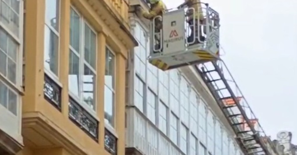 De inmediato se trasladaron los bomberos con un camión-escalera desde su base en el polígono de la Gándara y una vez ante el edificio procedieron a retirar algunos cascotes y sanear la cornisa ante la expectación de un buen número de ciudadanos que contemplaban la labor realizada.