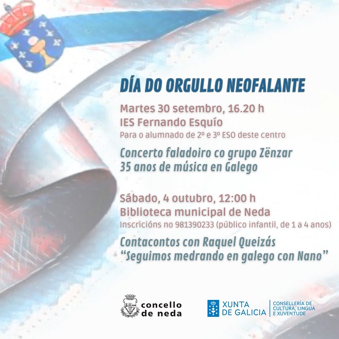 Con motivo do Día do orgullo neofalante (1 de outubro), unha celebración destinada a gañar novos falantes e espazos para a lingua galega, o Concello de Neda impulsa esta semana varias actividades especiais destinadas por unha parte á mocidade e por outra aos máis pequenos da casa.