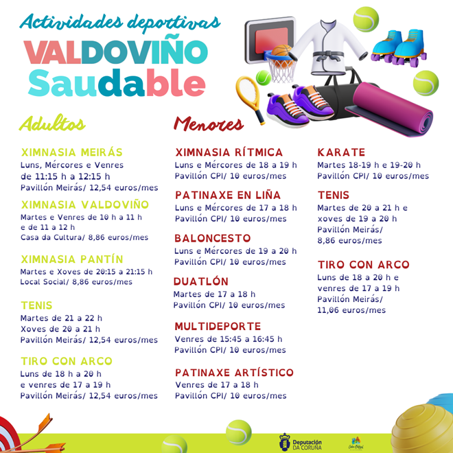 El coste de las clases oscila entre los 8,86 y los 11,06 euros, en función de la frecuencia y edad, y las actividades se desarrollarán hasta el mes de junio en diferentes emplazamientos como los pabellones del CPI Atios y el municipal de O Longoiro, o la casa de la cultura y el local social de Pantín.