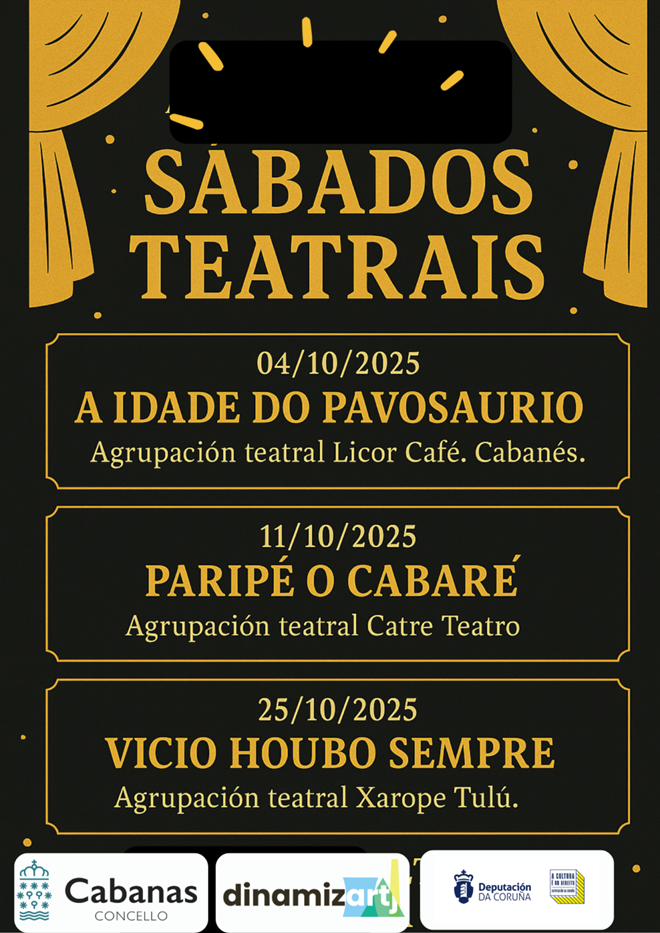 A las 19 horas estreno de la nueva edición del Ciclo do Teatro. «A idade do Pavosaurio» será la primera obra representada por el grupo teatral de Cabanas «Licor Café». Esta obra tratará las distintas situaciones en una casa en la que viven personas de distintas generaciones. Aforo libre. El Ciclo do Teatro tendrá actuaciones a lo largo del mes de octubre, organizado en colaboración con la red Dinamizartj y Diputación de A Coruña.