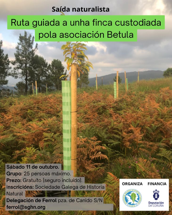 A Delegación de Ferrol da SGHN organiza co patrocinio da Deputación da Coruña a Saída Naturalista «Ruta guiada a unha finca custodiada pola Asociación Betula» que terá lugar o vindeiro sábado 11 de outubro.