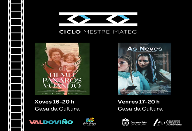 O Concello de Valdoviño programa esta semana dúas sesións do ciclo Mestre Mateo abertas á veciñanza. Así, este xoves 16 de outubro, o auditorio da casa da cultura acolle ás 20 horas a proxección do documental «Filmei paxaros voando», e o venres 17 á mesma hora, da longametraxe «As Neves».