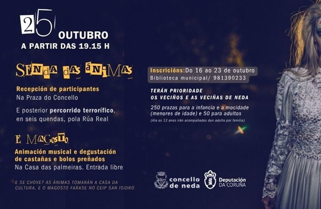 Neda prepárase para vivir ao grande a celebración do Samaín e tamén o seu tradicional magosto. O núcleo urbano centralizará o sábado 25 de outubro a programación festiva, na que a terrorífica “Senda das ánimas”, chea de sustos, será a aposta central da xornada. En caso de chuvia, este singular percorrido guiado trasladarase aos distintos andares da Casa da Cultura.