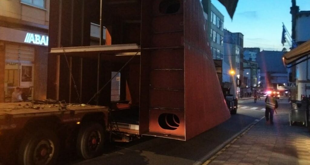La Policía Local ya había tomado precauciones especialmente en zonas estrechas y para evitar algún destrozo en señales de tráfico. Asimismo se desalojó de coches el tramo urbano de la avenida de Galicia. Eran las dos y media de la tarde cuando llegaba al puerto la primera pieza. Las mediciones fueron intensivas toda vez que el ancho de las piezas casi rozaba algunas viviendas en zonas estrechas del recorrido.
