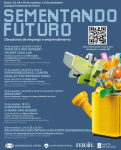 Las jornadas formativas “Sementando o Futuro. Obradoiros de Emprego e Emprendemento” están dirigidas a toda la comunidad universitaria y público general interesado. Todas las actividades son gratuitas pero precisan de inscripción previa. Más información llamando al 881 01 3674 o enviando un correo electrónico a transferencia.campus.industrial@udc.gal.