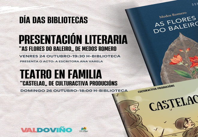 O Concello de Valdoviño celebra esta semana o Día das Bibliotecas con presentación literaria e teatro infantil. A primeira actividade terá lugar este venres 24 de outubro na Biblioteca. A partir das 19:30 horas, a autora local Medos Romero presenta a súa obra «As flores do baleiro».