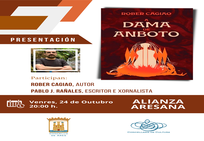Este venres, 24 de outubro, a partir das 20:00 horas o escritor nado en Bañobre (Miño) Rober Cagiao estará no salón de actos da Alianza Aresana para presentar, xunto co xornalista e escritor Pablo J. Rañales, a súa última novela: A Dama de Anboto, publicada recentemente tanto en galego (Calacán Editora) como en castelán (VR Ediciones).