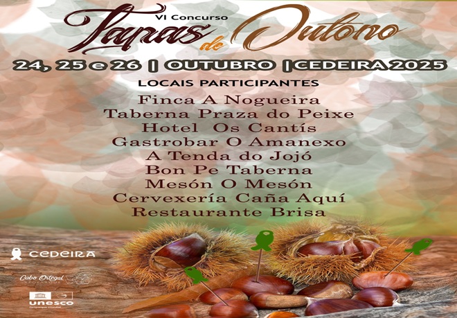 Un total de nove establecementos de hostalería de Cedeira participan do venres 24 ao domingo 26, na sexta edición do certame “Tapas de Outono”. Cada un deles servirá un petisco co melloriño da súa cociña ao prezo de 3€ e o publico poderá votar e participar no sorteo dunha cea para dúas persoas.