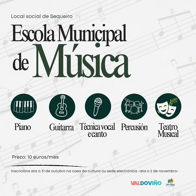 O Concello de Valdoviño abre este venres 24 de outubro o prazo de inscrición nas actividades da Escola de Música para o curso 2025-2026. Teatro musical é a principal novidade da programación, segundo avanzaba esta mañá a concelleira de Cultura, Rosana García. Súmase a piano, percusión, guitarra eléctrica e acústica e máis técnica vocal e canto. Iso si, para activar as clases é preciso reunir un número mínimo de participantes.