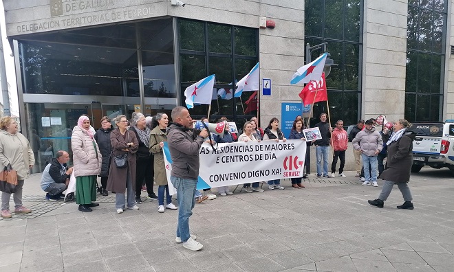 Las trabajadoras de residencias de mayores y centros de día de la comarca de Ferrol, convocadas por el sindicato CIG, se concentraron en la mañana de este jueves ante el edificio de la Xunta, en la plaza de España, para elevar la presión ante el bloqueo en la negociación del convenio colectivo, de lo que culpan a la patronal con la «complicidad» de la Consellería de Política Social y su máxima responsable, la conselleira Fabiola García