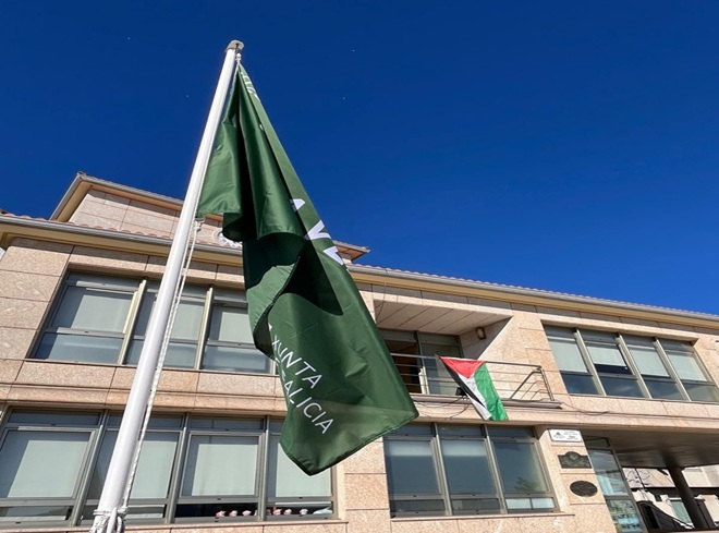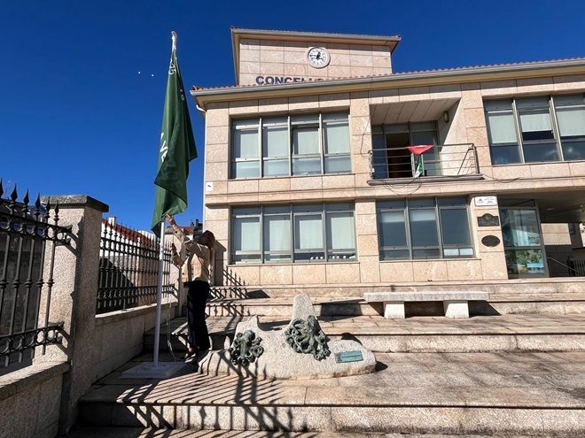 A concelleira de Medioambiente de Ares, Lucía Blanco, izou o galardón medioambiental que outorga a Xunta de Galicia á vila por segundo ano consecutivo, a Bandeira Verde 2025, na entrada do consistorio aresán.