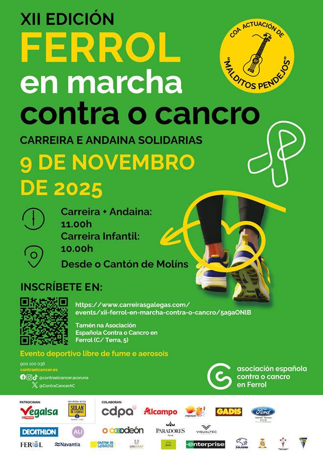 La XII edición de Ferrol En Marcha Contra o Cancro es posible gracias al compromiso del Concello de Ferrol, al patrocinio de Vegalsa-Eroski y Solán de Cabras, y a la colaboración de numerosas empresas y entidades que hacen posible esta jornada solidaria, Clínica Dental Patricia Aneiros, Alcampo, Teyca-Repsol, Gadis, Ford Galmotor Gonzacar Grupo Resnova, Decathlon, Ali Bebé, Centro Comercial Odeón, Paradores Ferrol, Visualtec, Navantia, Castro de Lobadiz, Unigraf, Error! Ferrol, Enterprise, Grupo Soledad, Arsenal Militar de Ferrol, Federación Gallega de Atletismo y Autoridad Portuaria de Ferrol-San Cibrao.