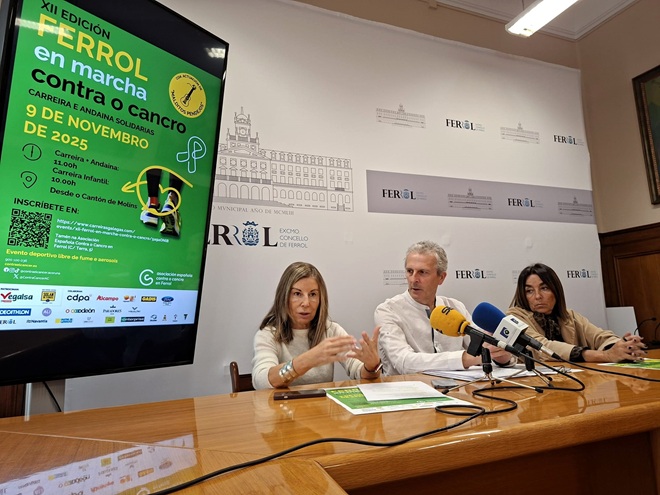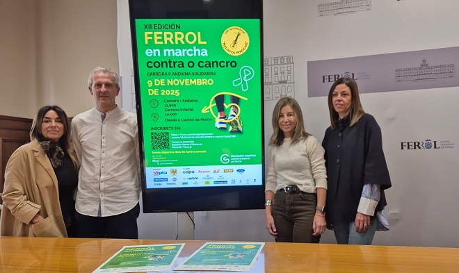 El Ayuntamiento de Ferrol acogió la presentación oficial de la XII edición de la carrera y andaina solidaria Ferrol en Marcha contra o Cancro, organizada por la Asociación Española Contra el Cáncer. La cita tendrá lugar el próximo domingo 9 de noviembre y volverá a llenar las calles de la ciudad de camisetas verdes, en apoyo a la investigación oncológica y al mantenimiento los servicios gratuitos que la entidad ofrece a pacientes y familiares.