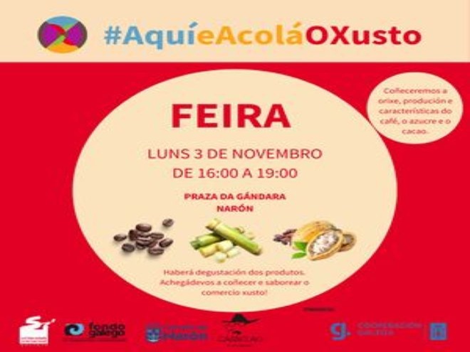 O concello acolle unha feira de produtos de comercio xusto no marco da campaña Aquí e Acolá O Xusto, que terá lugar o vindeiro luns 3 de novembro na Praza da Gándara entre as 16:00h e as 19:00 horas.