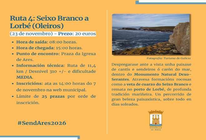 A concellaría de Deportes de Ares vén de anunciar a apertura das inscricións para o cuarto itinerario planificado dentro do SendAres 25-26, o programa de sendeirismo do Concello.