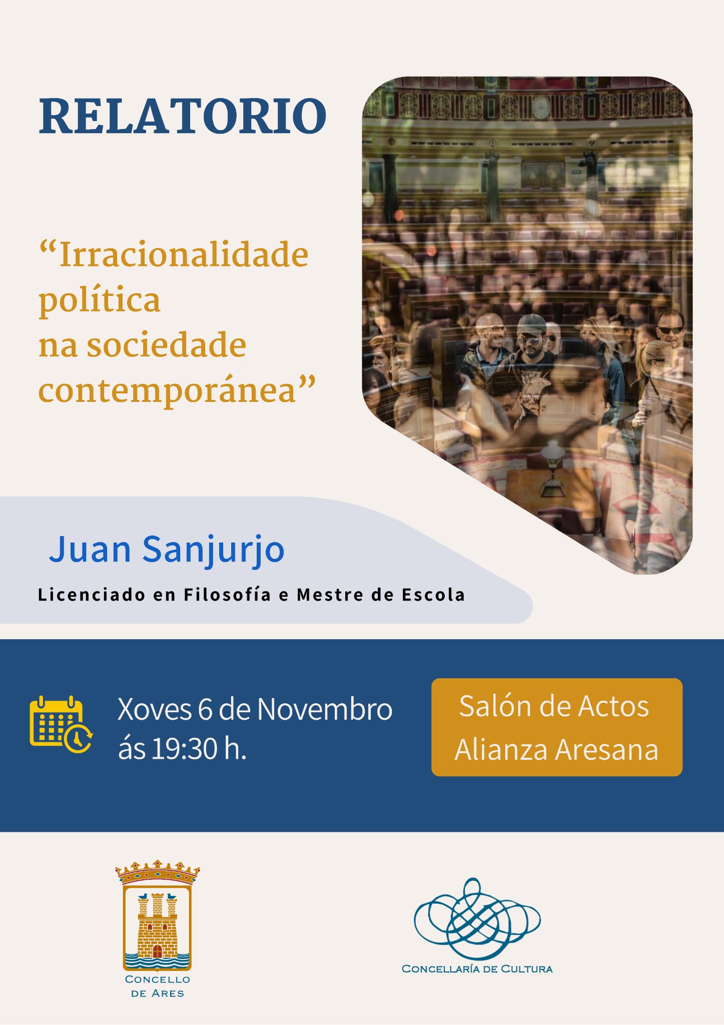 Baixo o nome ‘Irracionalidade política na sociedade contemporánea’, Sanjurjo debullará cuestións como a ultradereitización do ecosistema político-institucional, o sentimento de representatividade da cidadanía con respecto aos políticos e a deriva xeral que se está a vivir na actualidade.