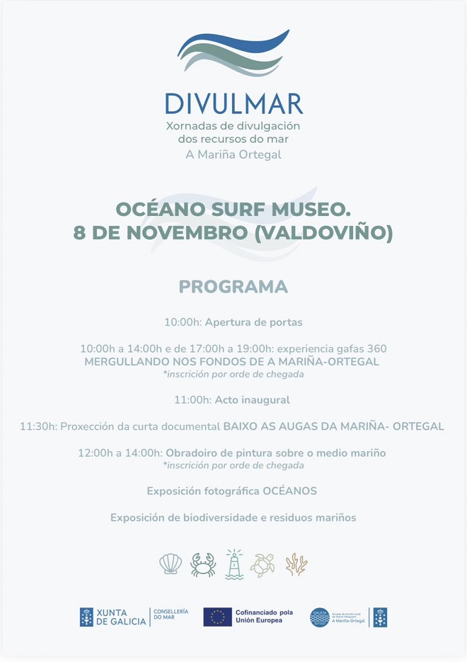 El Océano Surf Museo de Valdoviño propone vivir el mar en 360 grados a través de la jornada «Divulmar: La riqueza de los fondos marinos» que promueve el GALP A Marina-Ortegal. Se celebra este sábado 8 de noviembre con múltiples de propuestas de 10 a 14 horas y de 17 a 19 horas, para todos los públicos y completamente gratuitas.