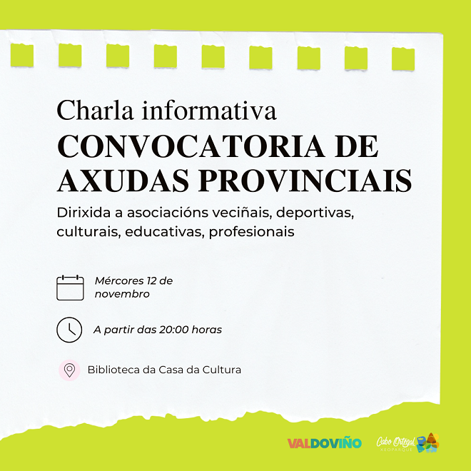 Dirigida a las entidades y asociaciones del ámbito vecinal, cultural, deportivo, social y educativo, así como pymes y profesionales autónomos, el Ayuntamiento de Valdoviño organizará este miércoles 12 de noviembre una charla informativa sobre las diferentes líneas de ayudas que promueve a Diputación provincial de A Coruña.