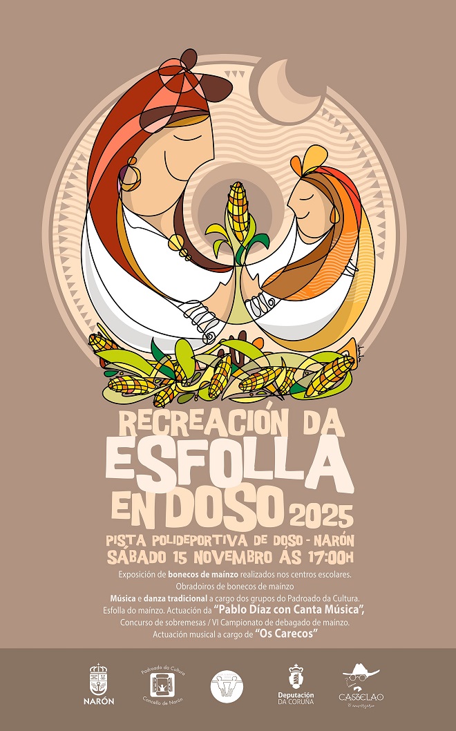 A parroquia de Doso acolle este sábado, 15 de novembro, unha nova edición da recreación da Esfolla, unha cita que cumpre preto de tres décadas recuperando unha das tradicións máis queridas do mundo rural galego. A actividade, organizada pola Asociación de Veciños A Naveira Doso, conta coa colaboración do Concello de Narón, o Padroado da Cultura e a Deputación da Coruña, e desenvolverase a partir das 17:00 horas na pista polideportiva de Doso.
