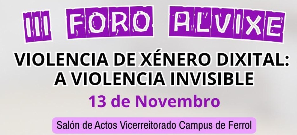 La asociación Alvixe organiza este jueves, día 13, la IIIª edición de su Foro, que se centrará en el tema de la «Violencia de Género Digital: La Violencia Invisible». El evento se llevará a cabo en el Salón de Actos del Vicerrectorado del Campus de Ferrol y reunirá a destacadas voces del ámbito académico, judicial, policial y de la sociedad civil.
