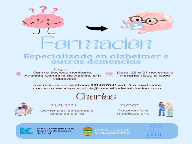 El Ayuntamiento de Valdoviño abre inscripciones en la Formación especializada en alzhéimer y otras demencias, dirigida a familias y cuidadores de personas afectadas de deterioro cognitivo y dependientes en general. La participación es gratuita, y la iniciativa consta de dos sesiones, que se celebrarán el martes 25 y el jueves 27 de noviembre, de 16 la 18 horas en el centro sociocomunitario de Valdoviño. Para anotarse, las personas interesadas deben acudir a los Servicios Sociales Municipales -planta baja de la casa consistorial-, llamar al 981 48 70 41 extensión 5, o enviar un email a servizos.sociais@concellodevaldovino.com.