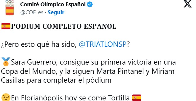 Sara Guerrero del Triatlón Narón y Miriam Casillas, del Triatlón Ferrol, sumaron dos nuevas medallas a su palmarés al hacerse con el oro y el bronce en un podio de la Copa del Mundo de Florianópolis (Brasil) dominado por las españolas.