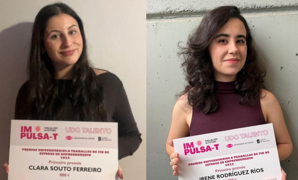 Foto: Clara Souto Ferreiro, a la izquierda, e Irene Rodríguez Ríos, a la derecha, recibieron su respectivo premio en un acto que tuvo lugar en el campus coruñés, la finales de octubre, durante la I Feria de Emprendimiento y de Apoyo al Empleo desarrollada en el marco del Programa IMPULSA-T de la Universidade da Coruña (UDC).