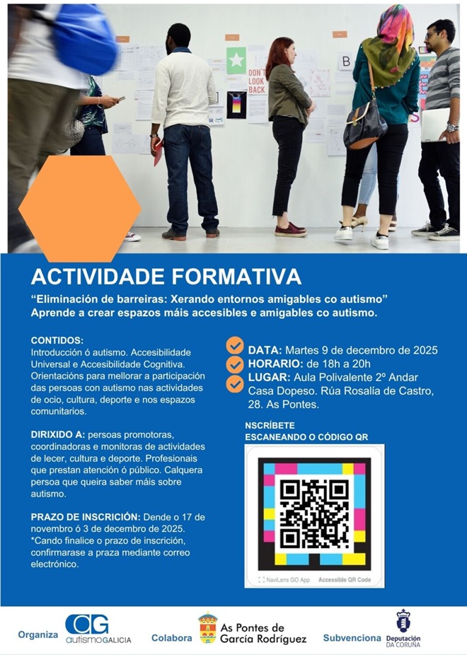 O Concello das Pontes será o escenario o martes 9 de decembro de 2025, dunha sesión formativa presencial organizada pola Federación Autismo Galicia, no marco do proxecto “Eliminación de Barreiras: xerando entornos amigables co autismo”, subvencionado pola Deputación da Coruña, que leva anos impulsando accións de sensibilización, formación e adaptación de contornas, co obxectivo de romper barreiras e facilitar a participación plena das persoas con autismo na vida comunitaria.