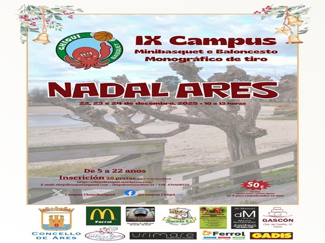 Empregando metodoloxías lúdico-formativas, o Campus impulsarase no pavillón polideportivo de Ares dende o 22 ao 24 de decembro, en horario de mañá (de 10:00 a 13:00 horas), para buscar a mellora deportiva e persoal da mocidade de 5 a 22 anos na súa práctica baloncestística. Ofértanse 20 prazas cun prezo de matrícula de 50 euros para non-empadroados na vila e 45 euros para aquelas persoas que residan en Ares.