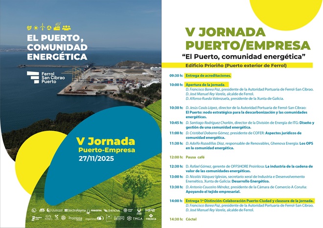 Bajo el título “El puerto, comunidad energética” el encuentro volverá a reunir a representantes de toda la comunidad portuaria, de las administraciones públicas y del tejido empresarial del sector energético. Durante la jornada, se analizará el futuro del puerto de Ferrol y su papel como agente clave en la descarbonización y las comunidades energéticas. Una fórmula basada en la producción de renovables y el autoconsumo compartido, que supone un paso adelante hacia un modelo energético más sostenible y eficiente, que permite reducir costes y favorecer el desarrollo económico del territorio.