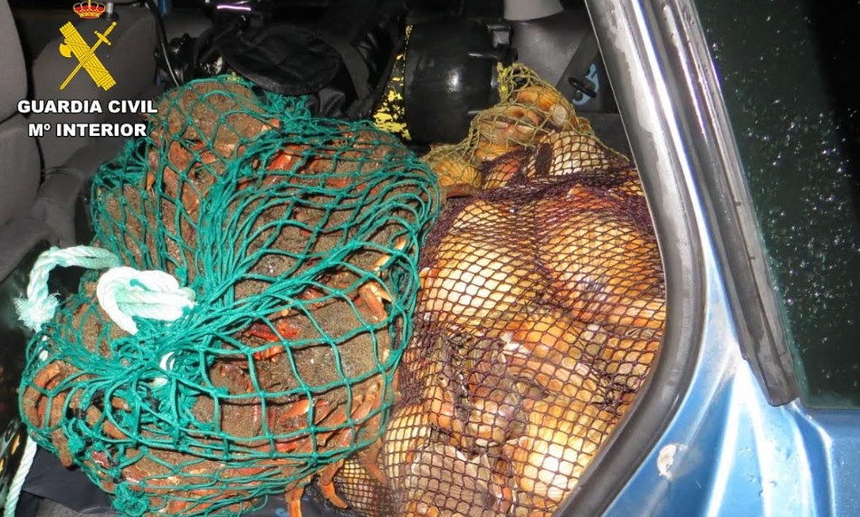 Los guardias civiles interceptaron el coche y procedieron a su inspección, en la que hallaron bolsas de red grandes con vieiras en su interior y otra con centollas, una botella de buceo y un cinturón de plomos.