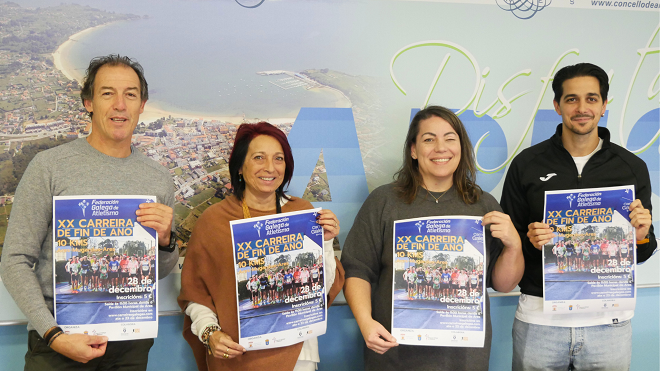 Los Ayuntamientos de Ares y Mugardos presentaron esta lunes la XX Carrera de Fin de Año que organizan conjuntamente año tras año, con hondas raíces en la Península de Bezoucos, para despedir el 2025 desde la práctica deportiva. Así, Alma Barrón, edila de Deportes de Ares, junto con el técnico municipal Javier Sánchez; Ana Varela, concejala mugardesa, y Bruno Rodríguez, coordinador del área técnico del Complejo Acuático del Castro-ServiOcio, desgranaron esta mañana los detalles de la prueba en el acto de presentación realizado en el consistorio aresano.