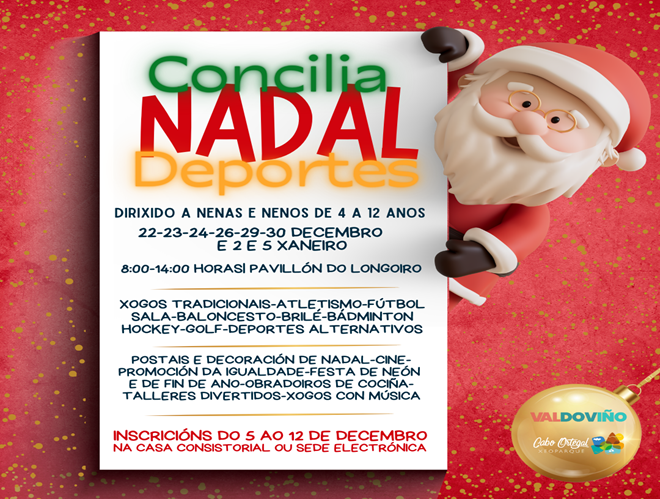 El Ayuntamiento de Valdoviño abre el plazo de inscripción en Concilia Deportes Nadal 2026, los campamentos con los que echar una mano a las familias a la hora de compatibilizar obligaciones laborales y familiares durante las próximas vacaciones escolares.