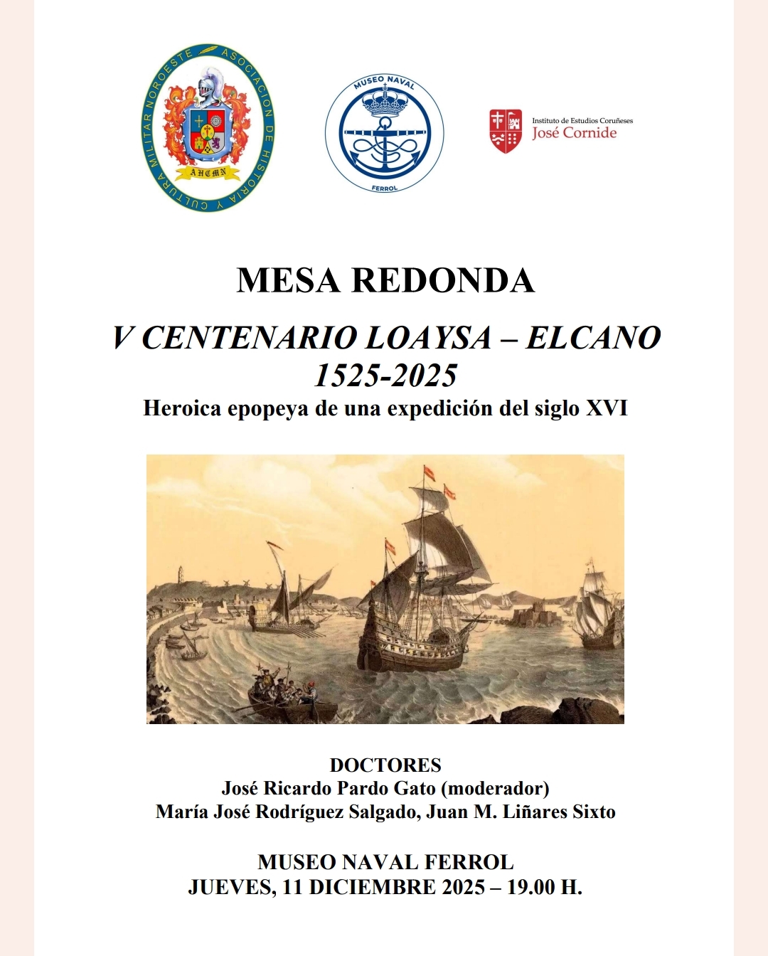 Con motivo de la conmemoración del V Centenario de la Expedición marítima que partió de la ciudad de La Coruña con destino a las preciadas “islas de las Especias” (Moluco o Islas Molucas en el Pacífico, parte oriental de la actual Indonesia), liderada en 1525 por García Jofré de Loaysa y en la que, entre otros intrépidos marinos españoles, también participó el célebre Juan Sebastián de Elcano, el Museo Naval de Ferrol acogerá el próximo jueves día 11 de diciembre, a las 19.00 horas, la celebración de una Conferencia/Mesa redonda, que lleva por título “V Centenario Loaysa-Elcano, 1525-2025. Heroica epopeya de una expedición del siglo XVI”.