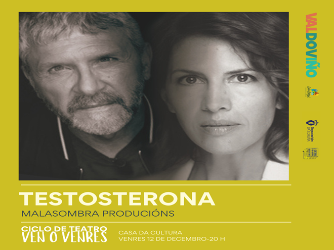 O ciclo municipal de teatro «Ven o Venres» convida ao público adulto a asistir esta semana á última función do ano. O auditorio da casa da cultura de Valdoviño acolle este venres ás 20 horas a representación de «Testosterona», dirixida por Xoque Carbajal e protagonizada por Camila Bossa e Luis Iglesia. A entrada é de balde e libre ata completar aforo, e a peza chega a Valdoviño co apoio da Rede Cultural da Deputación da Coruña.