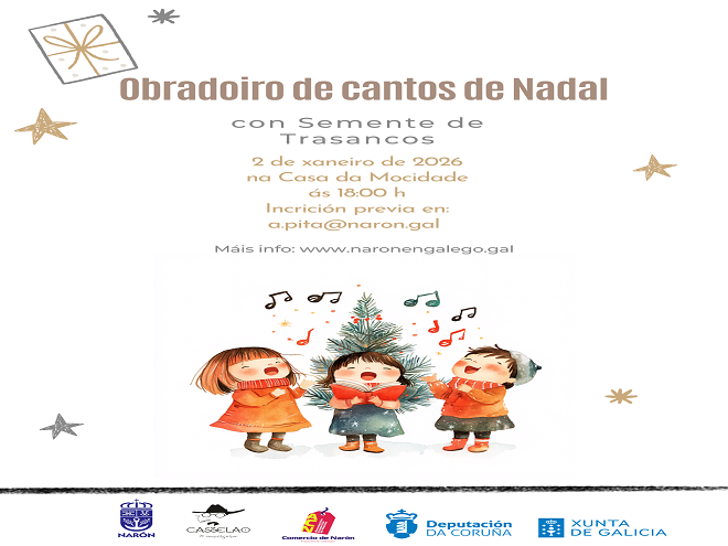 O Servizo de Normalización Lingüística (SNL) do Concello de Narón impulsa unha nova actividade de dinamización lingüística para estas festas: un obradoiro de cantos de Nadal impartido por Semente de Trasancos, pensado para recuperar a tradición galega do canto comunitario e, ao mesmo tempo, reforzar a presenza do idioma propio no comercio local.