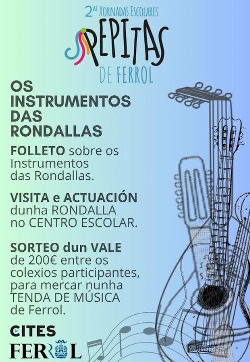 CITES FERROL con la ayuda de Cultura del Ayuntamiento de Ferrol, organiza las II Jornadas Escolares de “As Pepitas”, que esta vez están dedicadas a los instrumentos de las Rondallas ferrolanas. Entre los objetivos de estas jornadas están el de despertar el interés entre los más jóvenes para garantizar la continuidad de la fiesta, así como apoyar el reconocimiento de “As Pepitas” como fiesta de interés turístico nacional.