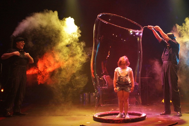 El público se sorprenderá con pompas transparentes, humo, vapor, pequeñas, grandes, estáticas o volando por el escenario… y de este modo, los espectadores podrán caminar de la mano de estos dos personajes por un mundo mágico, lleno de color y de mucho humo.