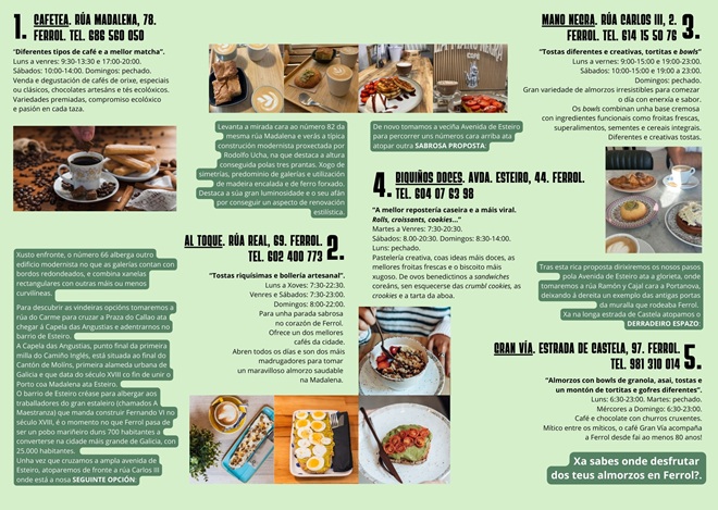 Baixo o título “ALMORZAR en Ferrol”, a ruta fai un percorrido por cinco establecementos que ofrecen almorzos moi especiais, cunha variedade de produtos doces e salgados que van moito máis aló do clásico café con leite con torrada ou algo de repostería. Agora o almorzo está de moda e permite incorporar prácticamente calquer alimento cunha creatividade inusual ata fai moi pouco tempo.