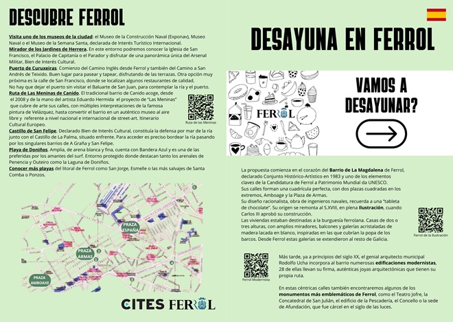 Dentro do conxunto de rutas temáticas que está a crear Cites grazas á axuda de promoción económica do Concello de Ferrol e, tras FERROL EN DOCE, deseñada o ano pasado para invitar a turistas, visitantes e aos propios ferroláns e ferrolás a descubrir as pastelerías da cidade á vez que coñecen o patrimonio cultural e monumental, agora chegou o momento de desfrutar dun rico, completo e variado almorzo en Ferrol.