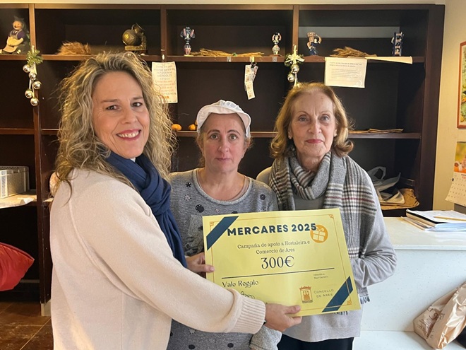 A veciña Mari Carmen Fernández Truébano recibiu das mans da concelleira de Comercio, Lucía Blanco, o segundo gran premio por valor de 300 euros do MercAres, a campaña de consumo de proximidade municipal, despois de que resultase agraciada nun dos rascas que recibiu na panadería do núcleo urbano La Gallega.