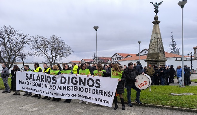 El acto institucional de inicio de las obras para ‘Abrir Ferrol al Mar’, presidido este viernes por la ministra de Defensa, Margarita Robles, tuvo una contrapartida reivindicativa a escasos metros. Unos 100 trabajadores civiles del Ministerio de Defensa, convocados por los sindicatos USO y CIG, se concentraron en la calle Iglesia –tras impedírseles el acceso al acto principal– para protestar por la «discriminación» salarial respecto al personal militar y la «excesiva» externalización de obras en el Arsenal.