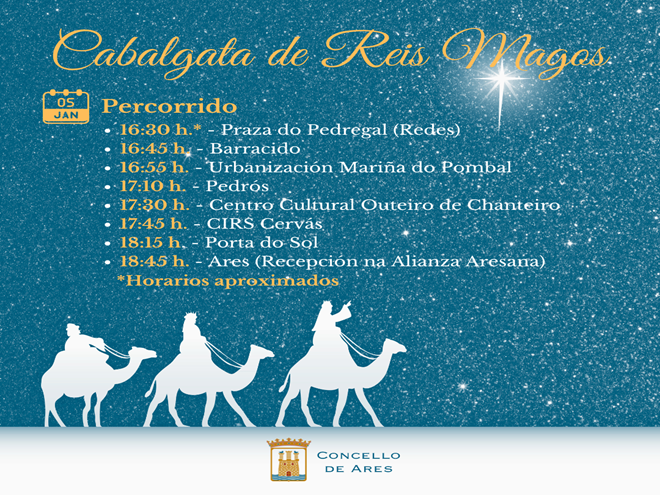 A carroza real sairá ás 16:30 horas dende a Praza do Pedregal de Redes para percorrer as parroquias do concello, incluíndo no itinerario Barracido, Mariña do Pombal, Pedrós, Centro Cultural Outeiro de Chanteiro e o CIRS Cervás. E dende Cervás emprenderán a viaxe en dirección a Ares, desfilando a partir das 18:15 h. na Porta do Sol polas rúas da vila.