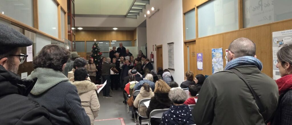 No baixo do concello, alleo ó rebumbio e gran balbordo, con algunha xente que deixou o lecer mesatonal, familiares dos cantores, algúns eumeses na diáspora noutras cidades de España, fixemos un conxunto especial que nun tempo record de concerto do nadal fixo pasar axiña a media hora longa de distintos sons. Así se cantaron panxoliñas pertencentes a outro século anterior, ou xa deste, máis actuáis de autores locais con panxoliñas galegas, e en castelán, dúas panxoliñas inglesas, e terminando co “Alegría en el mundo” (Ledicia no mundo) de G.F. Haendel tamén en galego.