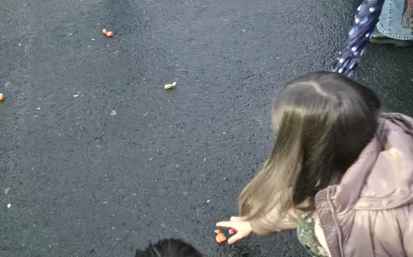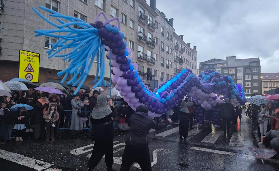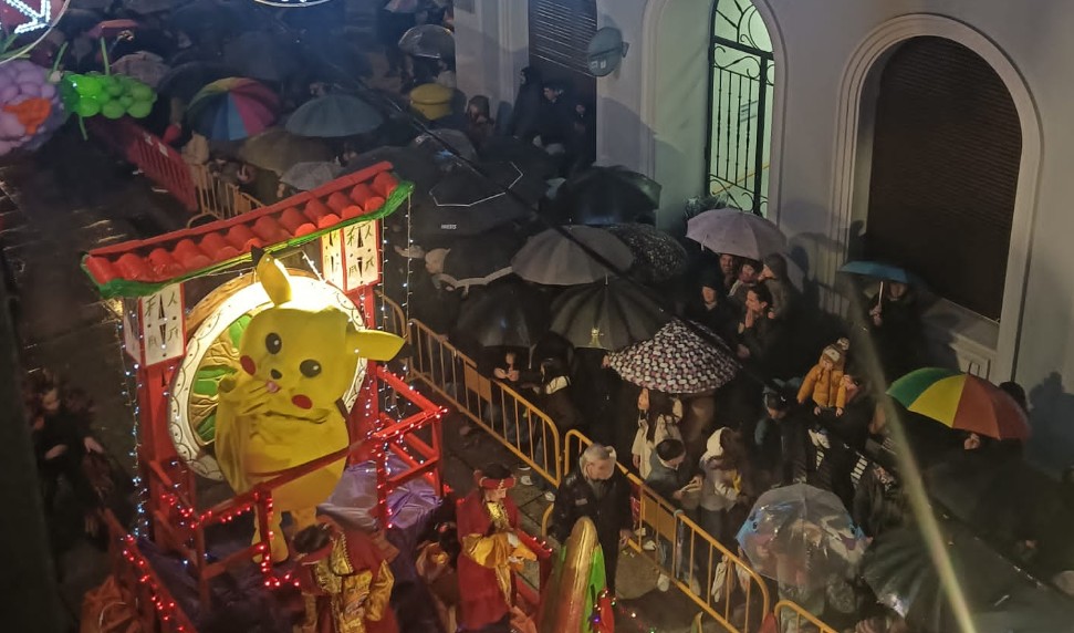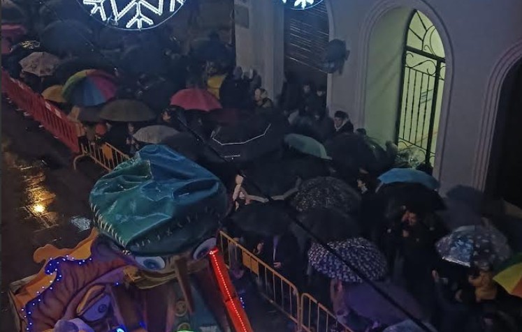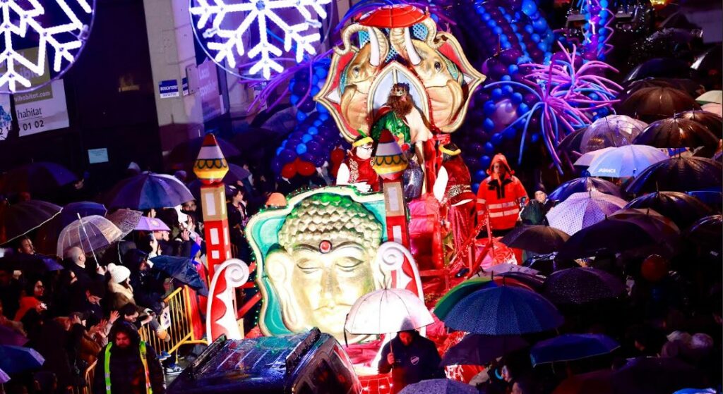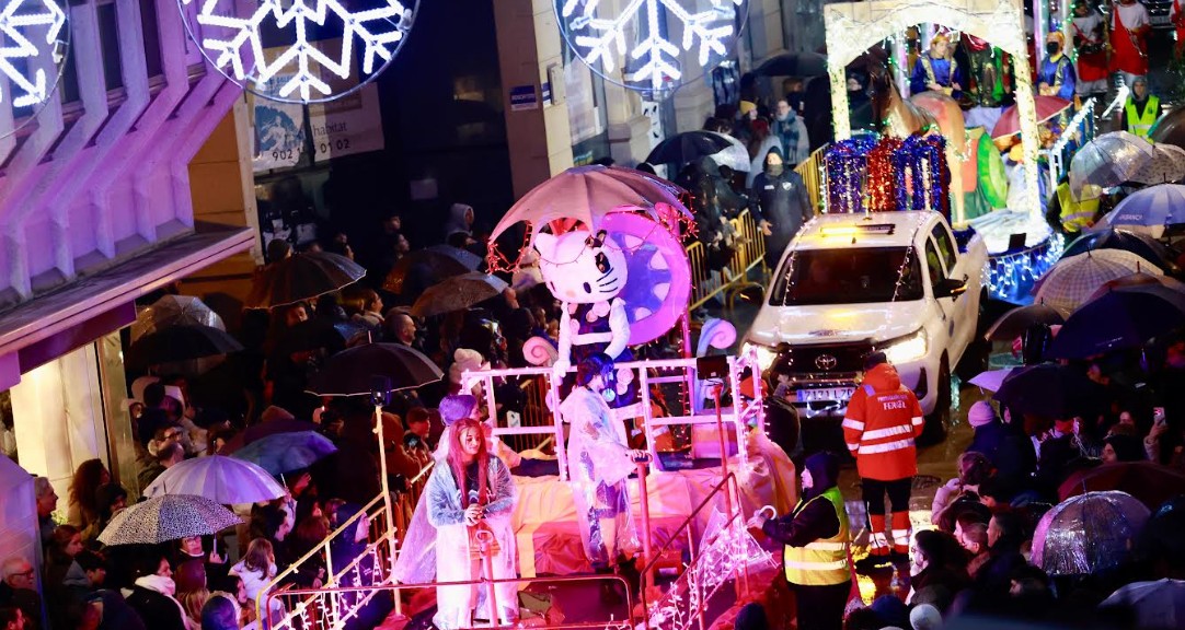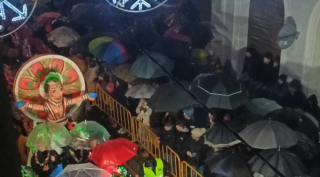 Las calles del recorrido al igual que la de Venezuela seguían abarrotadas y los paraguas eran parte del espectáculo, porque la lluvia regresó, aunque los componentes de la cabalgata iban ya provistos de plásticos desde el inicio de la misma.