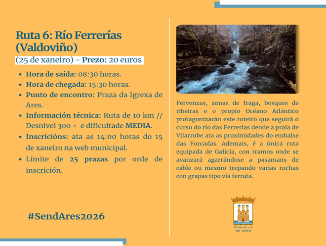 A concellaría de Deportes vén de anunciar a apertura das inscricións para o sexto itinerario planificado dentro do SendAres 25-26, o programa de sendeirismo do Concello.