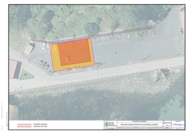 O lugar elixido está próximo á rampla pola que as embarcacións entran e saen do mar. Tal e como se especifica no proxecto técnico, a solicitude da concesión abrangue en total unha ocupación de terreos portuarios de 468m2, porque aunque inicialmente se van construír 300 en planta, a nave terá unha zona de servizo arredor e a previsión é completar máis adiante a instalación cunha zona cuberta no lado oeste.
